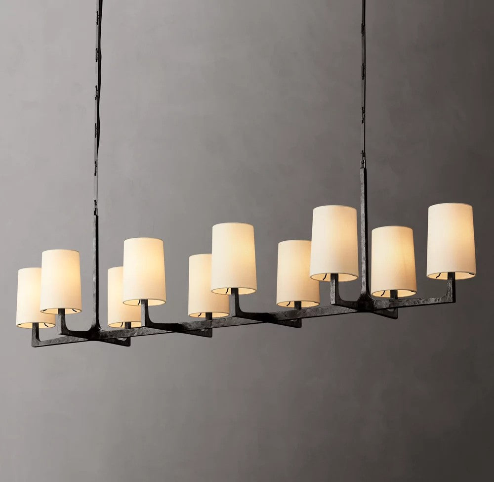 The Wright Linear Hammered Metal Chandelier blends artisanal texture with tailored sophistication. Featuring a handcrafted hammered metal frame and crisp white linen shades, this elongated fixture delivers balanced illumination ideal for dining tables and kitchen islands.